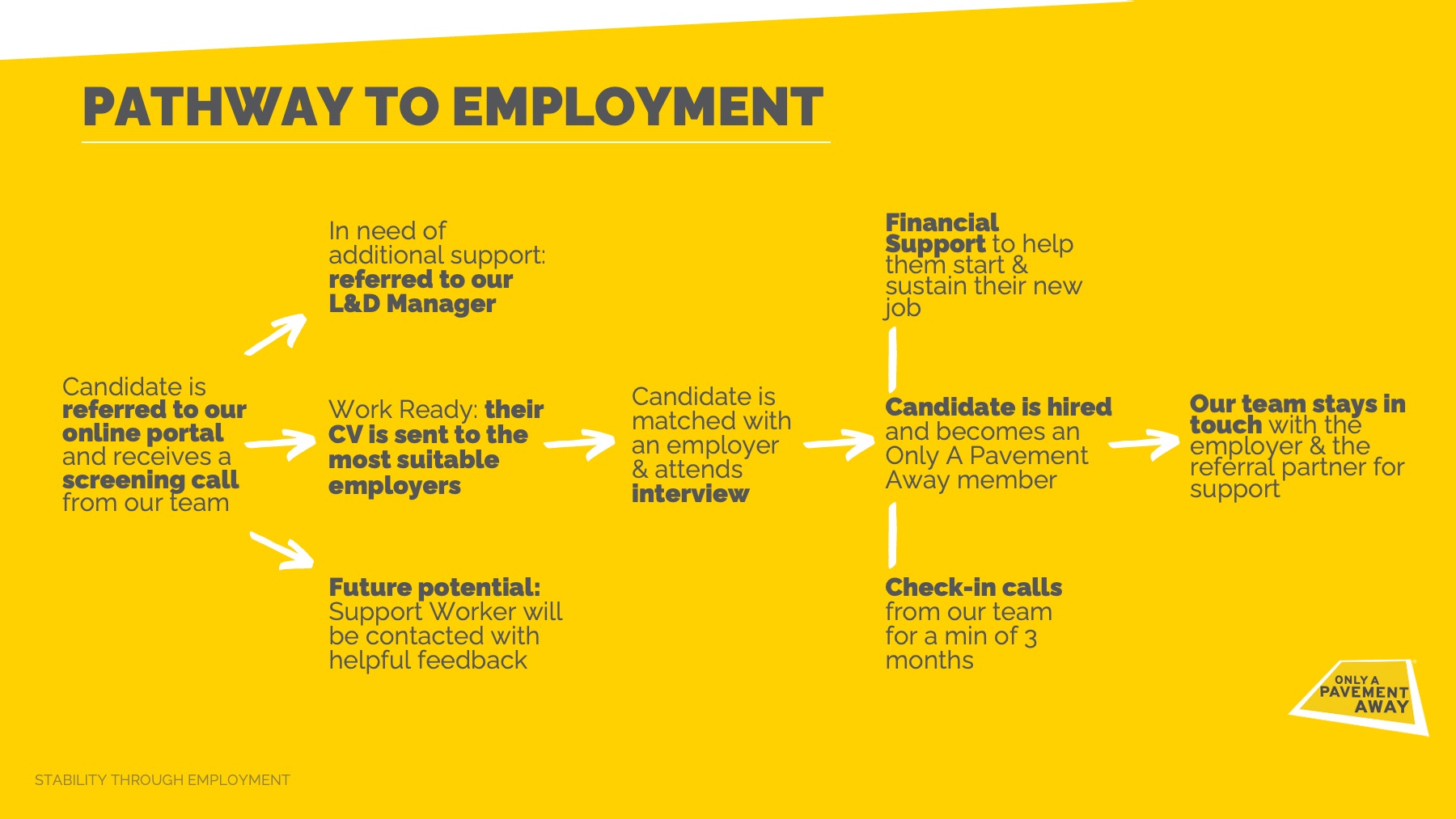 Once employed, a 12 months support network is arranged by the charity and Only A Pavement Away for the candidate.